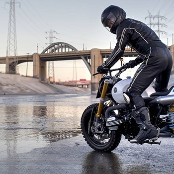 In addition to the rustic elements such as the studded tyres and the protective grid in front of the headlamp, there are also high-end details such as the stitched leather seat, the handles with leather inserts and the typical scrambler-style Akrapovic tailpipes in high-quality stainless steel. High performance parts by Öhlins and Gilles Tooling, clever solutions such as direction indicators integrated in the handlebar ends, the MotoGadget instrument panel and the contrastcut milled parts created by Roland Sands Design further emphasise the bike’s quality detail. The milled aluminium wheels – likewise contrastcut – were produced exclusively by BMW Motorrad, rounding off the motorcycle’s minimalist appearance.