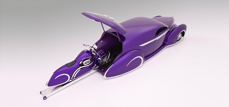 Cook conceived the concept of tucking a ’92 Harley Sportster inside the delivery after designing the car’s body shape with artist Frank Nicholas of Illinois. It required the use of a front-wheel drive platform to eliminate the rear differential so a minimum height rear floor could be attained to house a 39.5 inch tall motorcycle. Because a low cross member was required for a 9-foot long ramp holding a lowered bike to fit inside; for the rear suspension, Gary chose a Fat Man Fabrications front suspension setup with Air Ride Technologies air bags. Short tie rods attached to the frame prevent the spindles from steering in the rear. A nine foot long aluminum U-channel ramp, powered by an electric motor that turns an equally long threaded screw, moves in and out of the back of the car at the touch of a switch. The bike is rolled onto the ramp, strapped in position, and the ramp is electrically moved into the car.