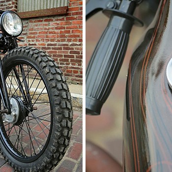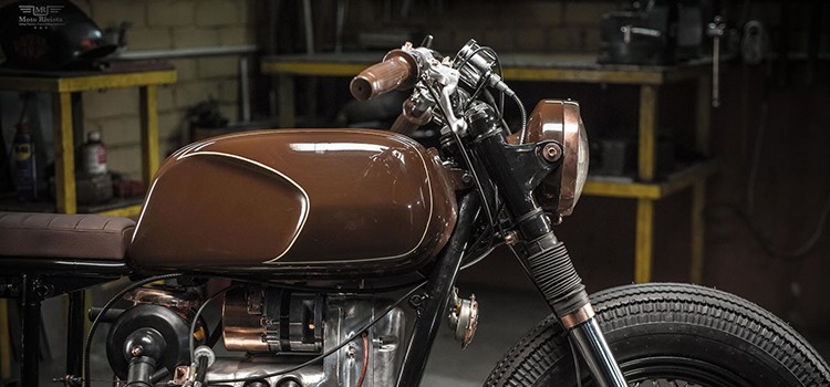 The base for this build was a classic Ural 650. To begin with the build the stock bike was stripped down to the frame, which has been heavily modified to adapt the new style. The standard Ural 650 engine has been paired with a Dnepr 4 speed gearbox and custom DoZer exhaust system. The use of copper adds the retro touch to this 650, to compliment the use of brown on this bike DoZer has crafted a custom seat with matching brown leather.