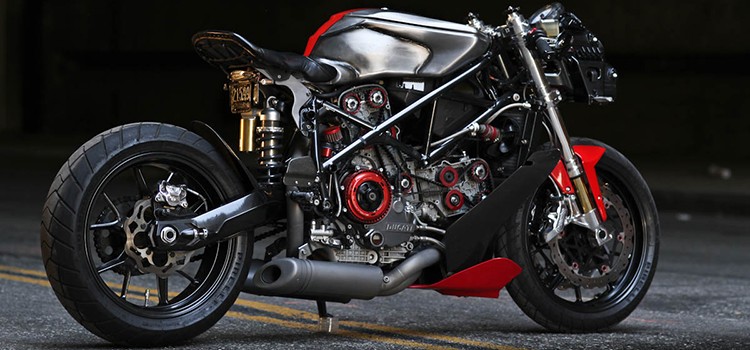 If you haven’t heard of Gustavo Penna or Apogee Motorworks, then this custom Ducati 749 ought to help imprint the names on you memory forever. The stock 749 started life as a canyon carver and weekend track bike for a couple of years before Gustavo decided to check out its innards. The Pierre Terblanche-designed fairings were stripped away for an apocalyptic look, and in went a more powerful 749R engine, complete with its racing cams, titanium valves, valve guides, connecting rods, magnesium head covers, a slipper clutch and carbon-fibre belt covers.