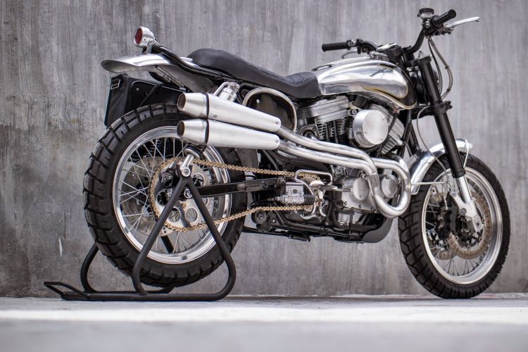 Much like any stock Sportster, the Scrambler started with a dropped-rear cruiser stance. With the front end high and the seat down low, we knew exactly what our first modifications would be. For the front end, we envisioned a more modern design and decided to slap on a late ’90s GSX1000 USD to lower the front. We decided to keep the Harley front hub, but we machined a new front axle and an adapter to accommodate the GSX’s double disc brakes. To raise the rear, we switched to longer rear shocks and raised the shock mounts by an inch, effectively giving us the signature scrambler stance we were looking for. Once we got that, we decided to switch to all wire spoke wheels with aluminium raised-center “dirt catcher” rims by Borrani. With both the street and the dirt in mind, we equipped the Scrambler with dual purpose tyres.