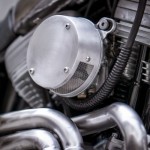 When considering options for a tank, we decided this bike would look best with an original design; so we made one following the design of the Harley’s V-twin motor. We added a stainless rack for detail and set the Monza gas cap off center. To finish off the tank, we added a black flame graphic to an otherwise bare aluminium polished finish.