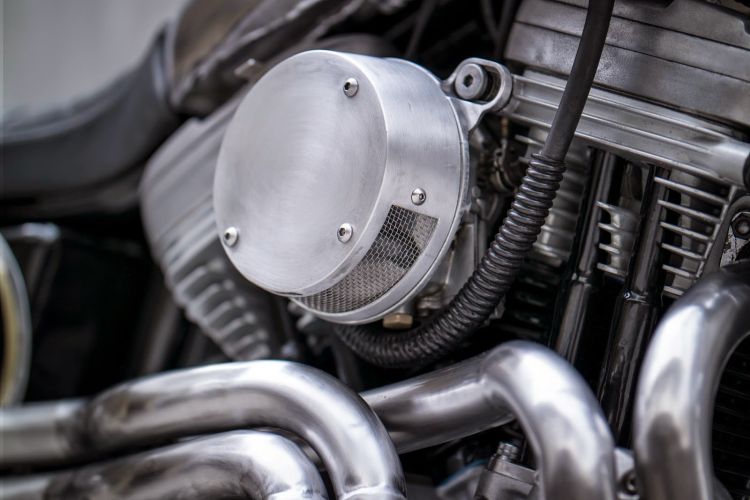 When working on the engine, we knew the first thing that had to go was the chrome finish so we sandblasted the side covers and the top end, leaving us with a pitted matte finish. We then swapped the stock 883 pistons with a 1200cc piston cylinder kit. We made our own air filter box out of aluminium and covered the air inlet with a stainless wire mesh. The stock belt drive was then swapped out for a chain final drive and the side cover of the engine was cut out, exposing the front sprocket and gold chain.