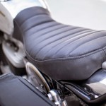 Having the tank follow the accent of the motor gave us a beautiful curve to play with when building our seat. To maintain the bike’s natural flow, we made the front of the seat follow the tail of the tank and curved the seat up toward the rear. In attempts to further abandon the bike’s previous life as a cruiser, we decided to make the seat as narrow as possible without exposing the frame rails. The seat pan itself is fiberglass and is wrapped in high-density foam fashioned with cowhide leather upholstery.