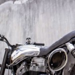 After finalizing the design of the seat, we made a custom oil tank to fit inside the midsection of the frame. Here, we notched the inside to fit a gel-cell battery giving this used-to-be cruiser the option for a rougher ride. We then added an aluminium number plate with a black patch and gold pinstripe.