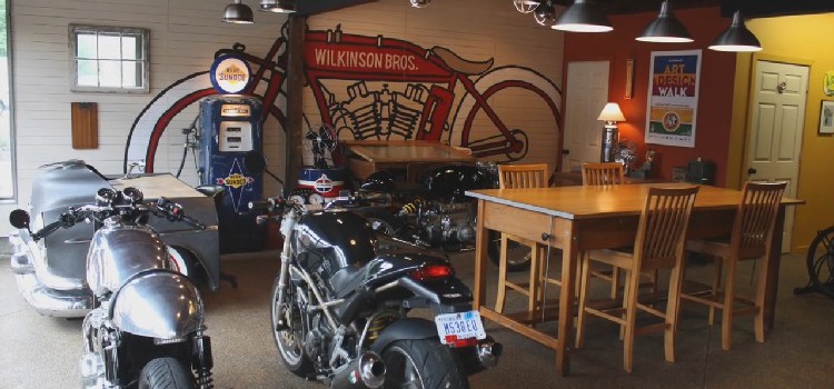 A behind-the-scenes look at a mural for Indianapolis, US-based graphic design & illustration studio Wilkinson Bros, featuring an illustrative spin on a 1913 Indian board track racer. The goal was to create a warehouse vibe with the horizontal slats (and not paint the existing tongue-n-groove paneling). It uses 1/4″ plywood slats nailed to furring-strip frame, a coat of white Kilz primer, a coat of tan interior house paint and acrylic paint for the bike.