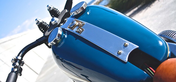 After everything was fabricated it was time for paint, Andrei chose beautiful petroleum blue, which for some reason just does not come through in photographs. The whole bike was wired using vintage style cloth wiring and connects all the brand new electrical components together, best of the best to avoid unwanted roadside breakdowns. Finally I chopped down the original seat pan and it was covered with new tan leather, well it’s not that new as it came from an old suitcase.