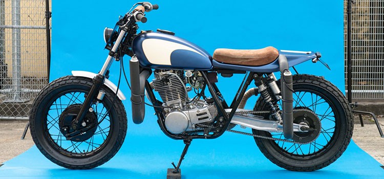 Finally, it was given a tracker look with an oversized Kedo oil pump, custom headlight mounted with custom headlight number plate, duck tail tracker seat cowl, custom-made pipes with a Super Trap muffler, Fork brace mounting the front fender, Mini speedo and K180 Dunlop tyres. The tank and seat cowl were treated to a fresh lick of paint as well. With custom surf racks fitted, this smirky custom Yamaha SR400 looks like it’s laughing all the way to the beach. Comments?