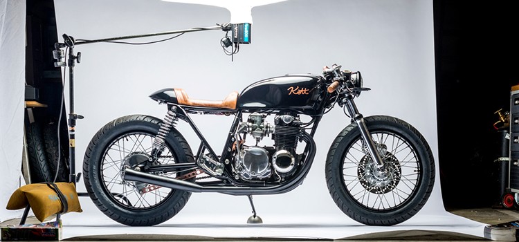 A look that lent itself well to the dark overtones of the black paint scheme and the timelessness of subtly placed copper and distressed brown leather. The headlight placement of this bike was also ideal. The intentionality of shortening the headlight brackets and using a smaller headlight bucket gave this bike a tidy and well packaged look. An additional experiment with the truncated seat gives the custom Honda CB550 a sense of animated proportions, offering the machine the look of an almost floating tank and seat combination; once again harkening to the vintage drag stance.