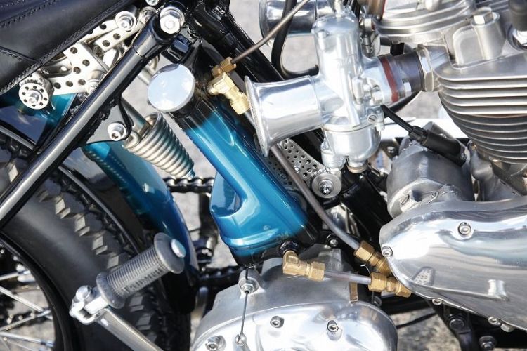 Trust the Japanese to take a classic British motorcycle, in this case a 1953 Triumph 6T Thunderbird, and turn it into something so rad. Dubbed “Lizard Tail”, the custom boasts familiar Heiwa styling, a handcrafted exhaust system, a comprehensively overhauled engine and bronze detailing on both the motor and the transmission. The one-off handlebar is equipped with AMAL grips, and set off with a bronze-decorated vintage fog light and a mini speedometer. Also sporting a custom fuel tank and rear fender, the extensively modified Triumph rolls on 19″ spoked wheels wrapped in AVON SM-MK2 rubber.