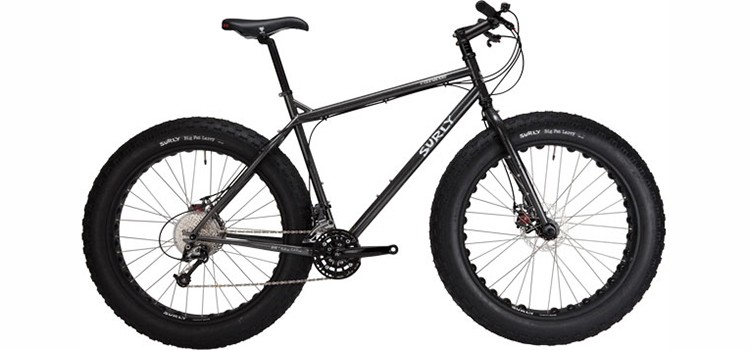 For the latest one, Surly have changed a few things. The 120tpi Big Fat Larry tyres now have a lighter casing, allowing greater conformation to the ground it’s rolling over and reducing rolling weight. The fork is offset like the frame to allow front and rear wheel interchangeability. And they’re now offering an extra large 24″ size, available as a complete bike and also frameset.
