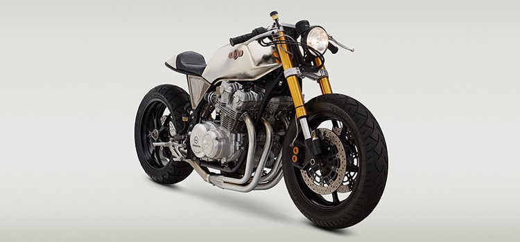 Super sweet Honda CB750F from Classified Moto’s John Ryland. Blending classic and modern styling cues and characteristics, the 1980 CB750F gets a new YZF R6-sourced front end, including wheel, fork and controls. The rear comes from a Ducati 1098, while the whole swingarm replaces the stock unit, and the Showa monoshock now stands out distinctly in the space beneath the new custom subframe. The exhaust, in typical Classified Moto style, is a four-into-one unit.