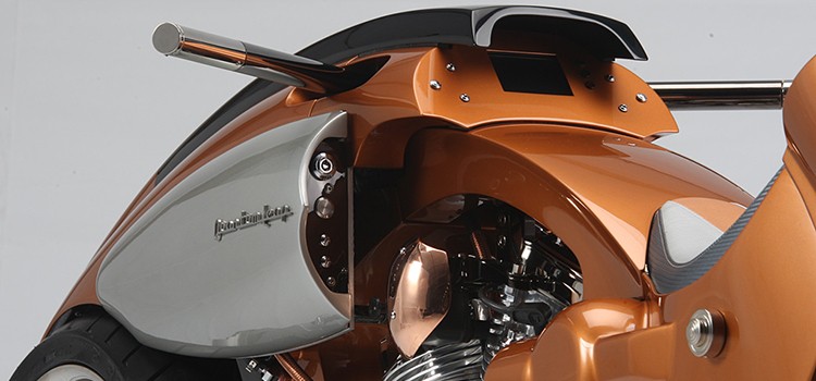 Built by Eddie Meeks of EAM Studios, Greensboro, NC, the Quantum Leap is less a motorcycle than a proclamation from its creator. The 13″-wide fixed front wheel gets engine power, while the thinner rear wheel handles the steering. Because the front wheel does not turn, Eddie was able to extend the sexy bodywork, which rides atop the tubular frame housing a Patrick Racing V-Twin and shiny handmade components, including a kickstand sculpted from copper-plated steel.