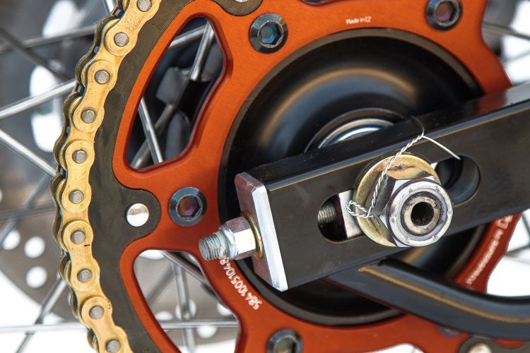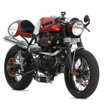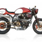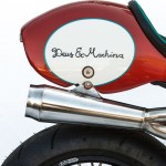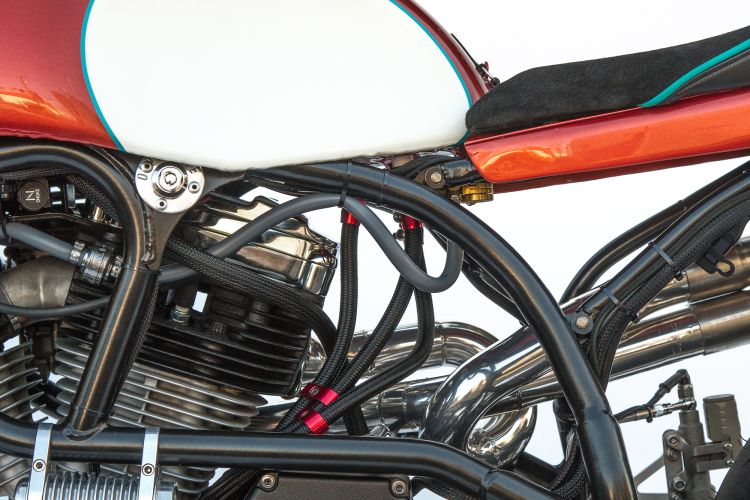 “It feels like a very well planted, comfortable, smooth riding bike even at extreme lean angles. For a heavy bike that’s kind of unusual,” says Woolie. “When you sit on that thing it shakes and it thumps and it pulls. The thing is just aggressive. It feels like a bully.” This bully’s a knockout, too. The aluminum gas tank and seat, both handmade, are shapes inspired by the ‘80s, the gas tank referencing an 80s TZ250 and the seat 80s Superbike. The paint scheme was derived from a pair of the owner’s self designed Nike high-tops. Asymmetric fender and speedo brackets, extending out from opposing sides, create a pleasant synthesis. Special thanks to Pierre Vallaincourt at Works Performance whose custom-built rear shock features a handmade fluid reservoir and James Eiland at Rizoma USA who has come through yet again with a bounty of Rizoma’s beautiful billet aluminium parts.