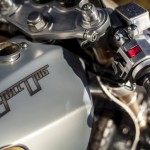OEM also ditched the original fuel tank for a vintage Japanese sportbike piece. Nifty details abound, like the velocity tanks peeking through the top of the tank, a small mesh cowling surrounding the twin headlights, and hand-tooled leather for the side panels, grips and peg inlays. At the rear is a pair of custom-made struts chromed and painted to match the front end, set off with 2.5” stainless pipes and a matte silver/gold paint scheme by Black Shuck Kustom.