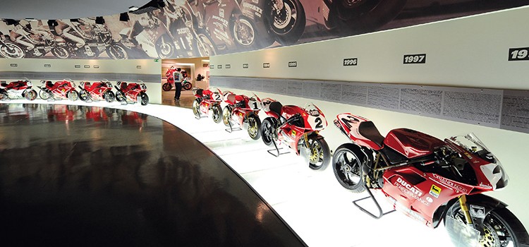 The Ducati Museum, which covers an area of 850 square metres, offers an impressive way to discover the origins of the company as well as admire the magnificent display of over 40 motorcycles that have been fundamentally important to the racing heritage of Ducati, as well as writing the history books of motorcycling. The exhibition surrounds a giant red helmet with motorcycles displayed on an illuminated track and seven additional thematic rooms, each creating an emotional experience with associated historic videos and mementoes.