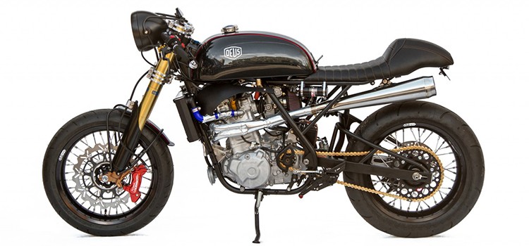 Built by Michael Woolaway, Deus Ex Machina USA’s Motorcycle Design Director. Transforming one of the winning-est Baja racers into a road-worthy, super-single-styled café racer, Boodaak is Woolie’s tenth signature build. A moniker derived from the sounds of the engine as you roll on (boooo) and off (daaaak) the throttle, Boodaak is as fun to ride as it is to say. Custom tuned by Jim Wood at Southland Racing, the engine is an HRC Johnny Campbell-spec Honda XR650R motor with oversized valves and a Carrillo rod. The bike was designed and built for an experienced rider of smaller build who was looking for a really aggressive, high performance, small-ish bike, making the XR motor the perfect match. Boodaak features a custom chromoly frame and swingarm, and sports a Racetech shock, valved by Jimmy Woods one of the top flat track tuners in the country. Woolie built a big aluminium radiator and the metal and stainless steel work has a forward leaning edge to it with kind of an art deco feel. The seat was designed to feel like an old school Ferrari. A lot of care was taken to shape the dual port exhaust to come around inside the frame from behind the radiator and come out the same side. “The bike is just incredible to ride,” says Woolie. “You get on the track and your knee is on the ground immediately. It turns and accelerates and does everything that it should do.”