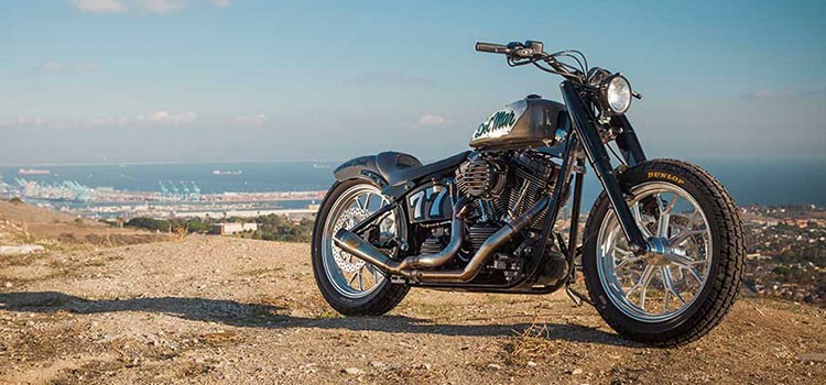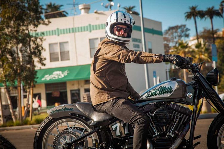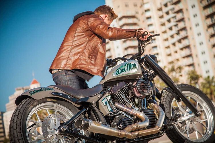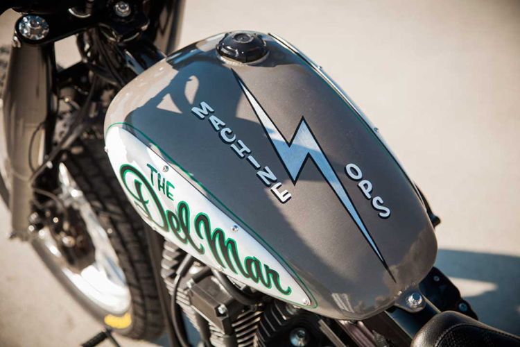 Roland Sand Design’s Del Mar Softail is a homage to the original ‘Go Left Fast Track’ in Southern California, the Del Mar Mile. The custom Harley-Davidson Heritage Softail’s stance is inspired by bobbed big-twin racers of the past, but with a modern twist. The team bead blasted their Vintage Kit and gave it a clear powdercoat that allows the raw metal to shine through, along with hammering out a couple of aluminium fuel tank side panels and welding some threaded bungs into the tank in order to bolt them on.
