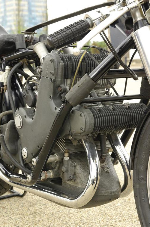 Conceived towards the end of WWII, the Porcupine was originally designed to be run either with or without forced induction. Supercharged multi-cylinder engines had begun to threaten the single’s supremacy towards the end of the 1930s and indeed, AJS themselves went down this road with their fearsome water-cooled V4. Fast yet difficult to handle, the latter had demonstrated that horsepower bought at the expense of excess bulk and weight was not the answer, so the thoughts of designer Vic Webb turned to a twin. Laying the cylinders almost horizontally with their heads facing forwards ensured adequate cooling and a low center of gravity while at the same time providing room, if required, for a blower above the gearbox. When the FIM banned supercharging at the end of 1946, AJS was ready with new cylinder heads designed for normal aspiration!