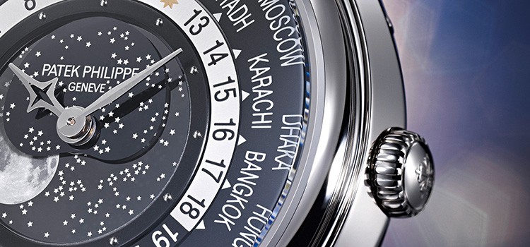 The multi-part dial features two rotating scales for the world time function (the outermost scale lists cities, and the inner rotating scale doubles as a 24-hour dial and day/night indicator. The new moon phase display is especially interesting because it is the first time Patek has rendered the moon so realistically, here on two superimposed metallized glass discs.