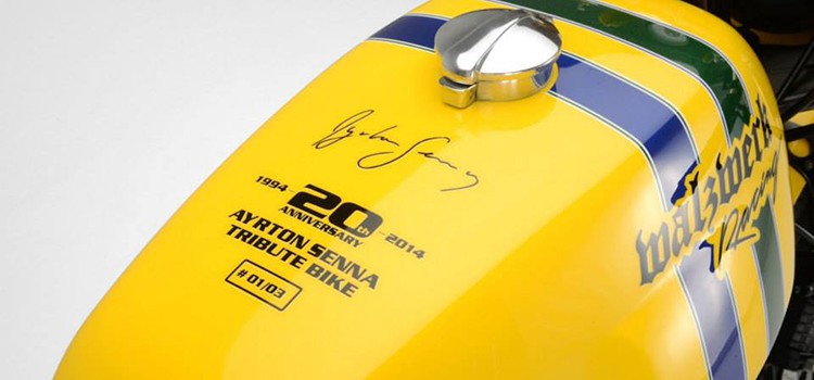 If you’ve been lucky enough to access the pit lanes during top-tier races, the likes of Formula One and MotoGP, chances are high that you’ve seen racers pootling around in scooters. A lot of them, including Michael Schumacher, Lewis Hamilton and Jenson Button, are hardcore motorcycle enthusiasts, and have some stunning examples, both stock and custom, stashed in their garages. Which brings us on to Marcus Walz, a familiar name whose builds we have featured before, the Walz Hardcore Hammer and the WCR900. With a clientele that includes Sebastian Vettel, Kimi Räikkönen and David Coulthard amongst others, Marcus is no stranger to top-shelf customs and, with this year being the twentieth anniversary of Formula One legend Ayrton Senna’s (another avid motorcycle fan) passing at Imola, the German builder has just crafted a stunning limited edition Moto Guzzi Le Mans in his honour.