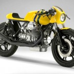 Based on 1970s Moto Guzzis from the Le Mans Mark I series, the Ayrton Senna Tribute Bikes are completely rebuilt from the ground up, with custom bodywork finished in colours inspired by Senna’s famous helmet designs, taken from the Brazilian flag and painted by Sid Mosca. The 850cc engine has been bored out to 1040cc, so that it now makes 90hp, while weight has been pared down to around 175 kilos.
