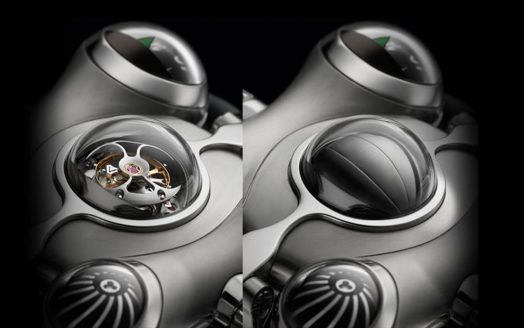 Inspired by classic Japanese sci-fi cartoons and 1970s biomorphic design, the MB&F HM6 Space Pirate Watch is a fantastically weird timepiece. Inside its solid titanium case, a new calibre made up of 475 different components, 68 jewels and a complex web of gears, turbines, and rotors keep the vertically-revolving hour and minute spheres moving underneath four of the watch’s 10 domed sapphire crystals.