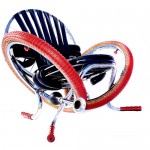 It is a low-slung, comfortable chair, and the forms of that first chair were inspired by the alternate beauty of a crashed bike, and the ‘potato chip’ form that a collapsed wheel takes. Check out Andy’s work on Bike Furniture.