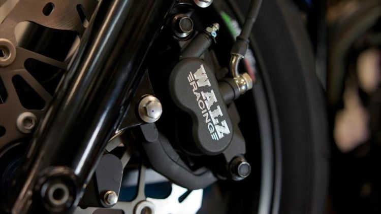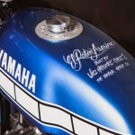 The custom Yamaha XV950 gets a full work over with the stock front-end suspension unit modified and lowered with prototype progressive springs whilst the rear gets fully adjustable Öhlins shocks. Hand-cast magnesium wheels by Marvic are fitted with custom adapters made in house. Custom rear sets change the ride dynamic giving a sportier sitting position. Modified front and rear brake calipers clamp on to Wave rotors front and rear for stopping power and the bike is finished with a stunning pale blue retro paint job, pin striping, and of course Yamaha speed blocks.