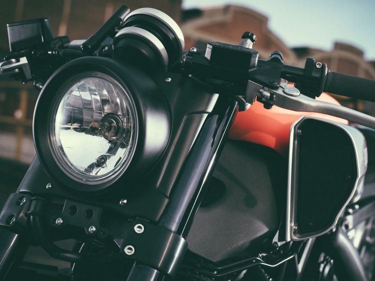 Starting at the front end, a custom-made aluminium mudguard sits below a JvB-moto signature style custom carbon fibre headlight unit integrated into the front forks and Motogadget indicators above custom carbon wheel covers. Modified aftermarket clip-on bars add the café racer element and the rider looks down on an authentic American dragster rev counter by Autometer. A beautiful custom carbon tank cover sits over a heavily modified airbox and electrics and is complemented by special air intake scoops crafted from stock aluminium units taken from the original 80’s VMAX.