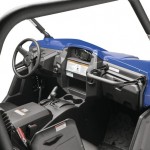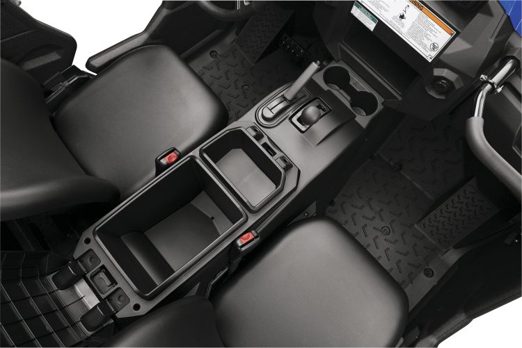 Inside, soft and secure high-back bucket seats ensure high levels of comfort and support. Each seat has a three point seat belt and shoulder bolsters, and the driver’s seat has 3-position adjustability with a total of 90mm of movement. For added comfort all contact points in the knee and calf area are smooth, and a 3-point adjustable passenger handhold gives added security on steep or bumpy terrain. The dash features a digital display panel that includes a speedometer, odometer, dual trip meters, hour meter, clock fuel gauge, gear position and four wheel drive setting – and a standard 12V outlet in the cab is there to power various devices.