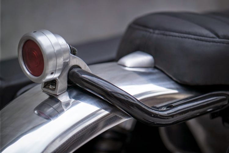 With the Scrambler starting to look as wild as we dreamed, finding an aftermarket headlight bucket and tail light to suit our build became an increasingly difficult task. As you can probably imagine, we encounter this situation quite often, and like all the other times before, we decided to build our own from scratch. We built a headlight bucket that we wanted to tuck between the fork legs; so we designed it to be as narrow as possible. The tail light was made of bare aluminium and bolted onto the tail of the frame, wrapping around the frame end loop.