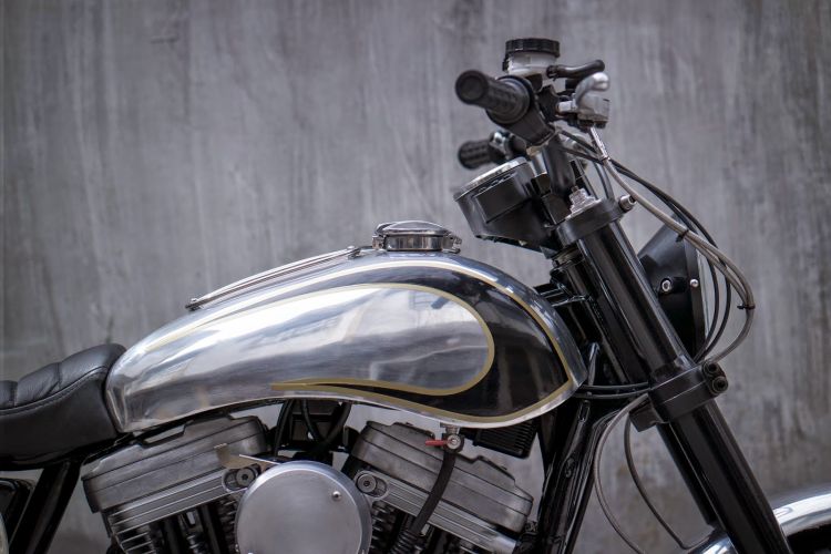 When working on the engine, we knew the first thing that had to go was the chrome finish so we sandblasted the side covers and the top end, leaving us with a pitted matte finish. We then swapped the stock 883 pistons with a 1200cc piston cylinder kit. We made our own air filter box out of aluminium and covered the air inlet with a stainless wire mesh. The stock belt drive was then swapped out for a chain final drive and the side cover of the engine was cut out, exposing the front sprocket and gold chain.