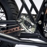 A look that lent itself well to the dark overtones of the black paint scheme and the timelessness of subtly placed copper and distressed brown leather. The headlight placement of this bike was also ideal. The intentionality of shortening the headlight brackets and using a smaller headlight bucket gave this bike a tidy and well packaged look. An additional experiment with the truncated seat gives the custom Honda CB550 a sense of animated proportions, offering the machine the look of an almost floating tank and seat combination; once again harkening to the vintage drag stance.