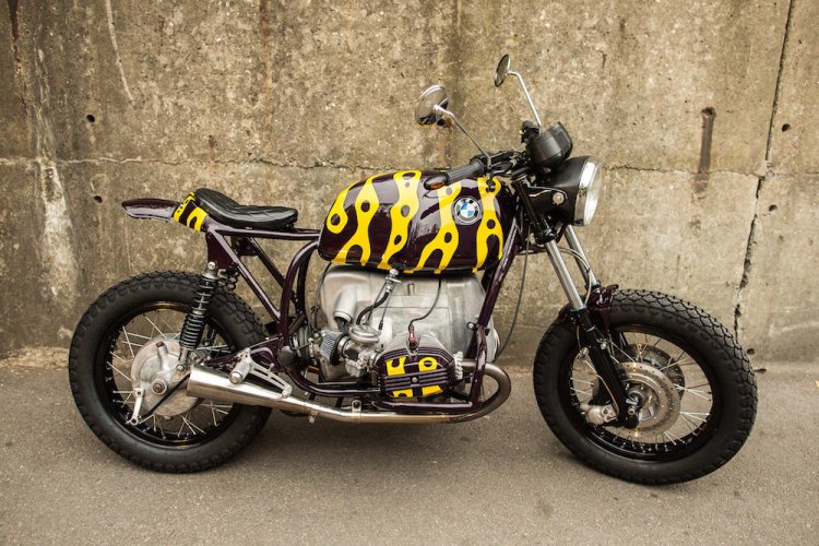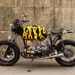 BMW’s classic R80/7 has been receiving a lot of attention from custom builders lately, thanks in no small part to the tough 800cc engine and the charismatic style of the twin exposed cylinders. This stunning example by Surrey-based 2WheelsMiklos is inspired by the South American poison dart frog, hence the luscious brown and bright yellow paint scheme.