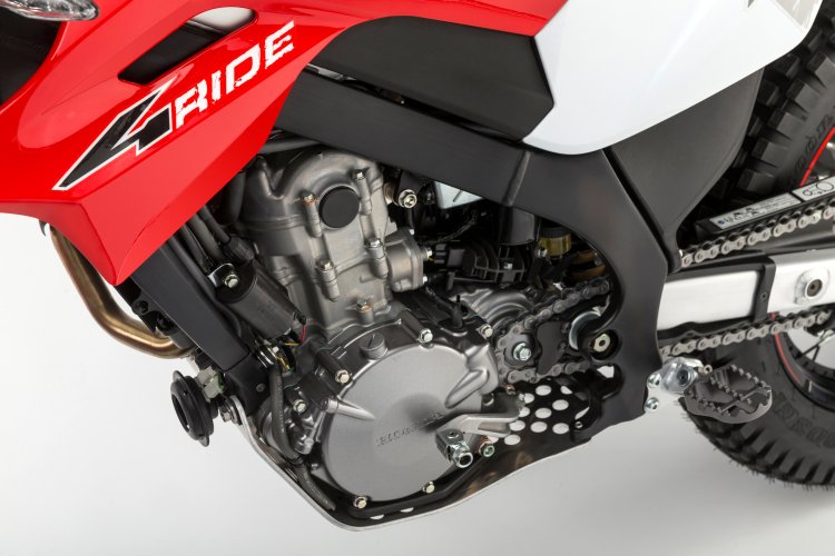 The development team of the Honda Montesa 4RIDE took the basis of the Cota 4RT260 to create a motorcycle for adventure riding, with all its well-known advantages of excellent response, lightness and versatility. To achieve this, the thermodynamic group features a completely revised gear ratio, wider than on the trials motorcycles, offering the rider more comfort at a steady speed and improved performance on long routes. With the same objective in mind, the ergonomics have also been revised, incorporating a seat and elevating the height of the suspension system, including both the fork and the shock absorber.
