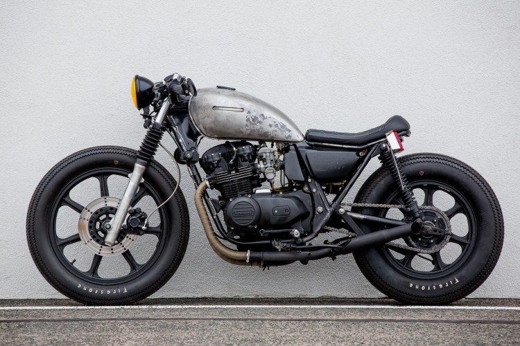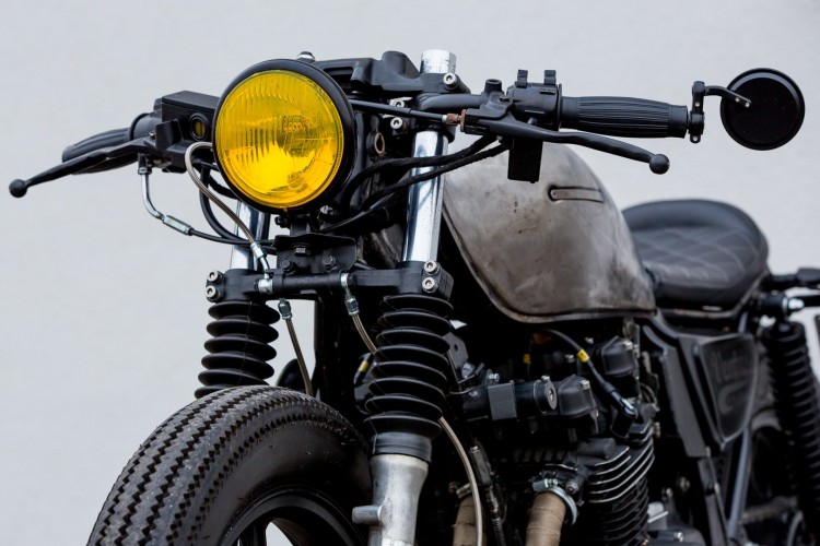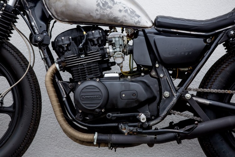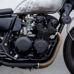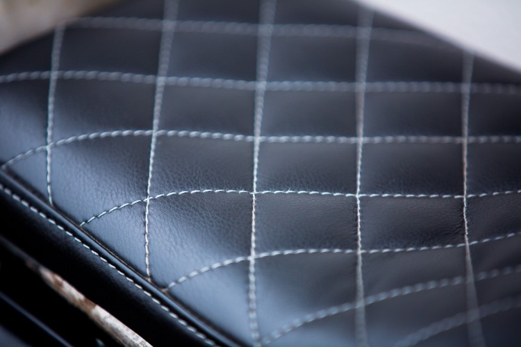 On the performance front, refreshed Mikuni carbs with larger jets, NGK spark plugs, and wrapped exhaust pipes are joined by RM sprockets and chain. Firestone Deluxe Champion tyres, sized 4.00-19″ front and 5.00-16″ rear add to the overall charm, with stainless steel braided brake lines take care of stopping duties. The build is topped off with a custom-made seat, clip-on handlebars, Beston grips and a 5.75″ Bates headlight wrapped with yellow foil.