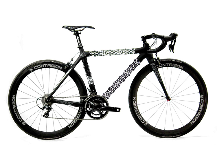 Based in Lindon, Utah, Razik Bicycles manufacture high-end road and mountain bikes, the highlight being the use of Isotruss composite technology, combined with precision layup, proprietary fabrication processes, carbon-fibre, and carbon nanotube technology. While their other model, Epitome, is a mountain bike hardtail, Vortex is at home displayed in a gallery as it would be hammering over mountain roads.