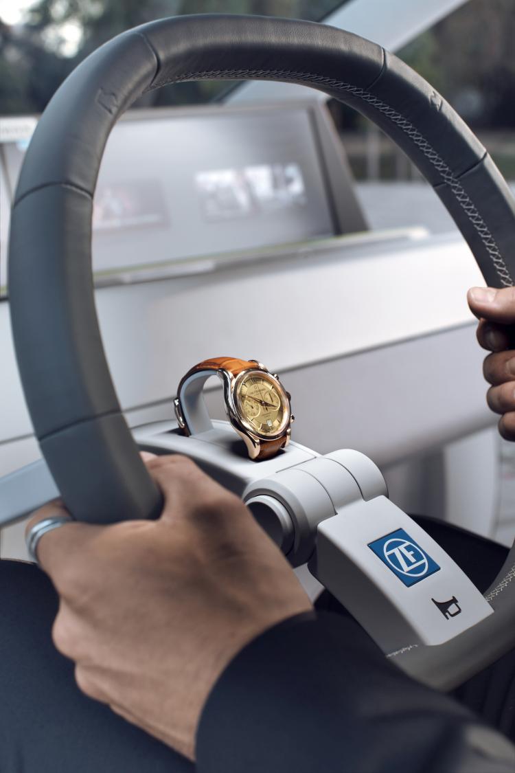 The multifunctional automatic Oasis concept also serves as a stage to unveil one of Carl F. Bucherer’s first new product launches for Baselworld 2017, the world’s largest watch and jewellery exhibition. The new Manero Flyback is embedded within the steering wheel of the sophisticated vehicle, winding the watch and delivering energy with every movement.