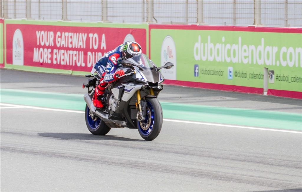 Following the press conference by the Yamaha team, the official unveiling of the striking Yamaha R1 2015 took place with Jorge Lorenzo removing the covers of the brand new vehicle in the Technical Bay Garages. He was later joined by 12 riders who are owners of YAMAHA motorcycle in Dubai as they took over the track to ride with the champion. Guests at the event then witnessed the new R1 in action as the four time world champion took to the tracks for an exclusive demo ride in the vehicle.